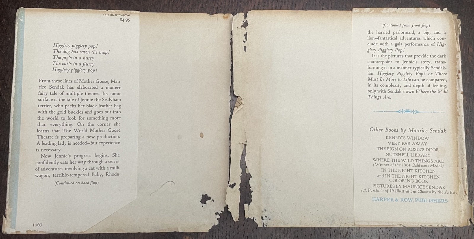 Book Details + Condition: Harper and Row Publishers (New York). First Edition, 1967. Hardcover with original dust jacket. 69 pages. With text and illustrations by Maurice Sendak. Inscribed and signed by Sendak on the front free endpaper. Firm binding; light wear to boards, with some fading to extremities and spine; interior is clean and free of markings, save Sendak's signature and inscription to ffep. Dust jacket is present, but shows significant wear and deterioration; it is now split in two (please see pictures). All books are carefully packed, and shipped in boxes.