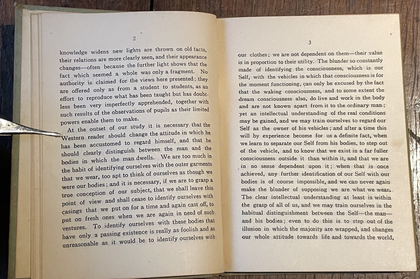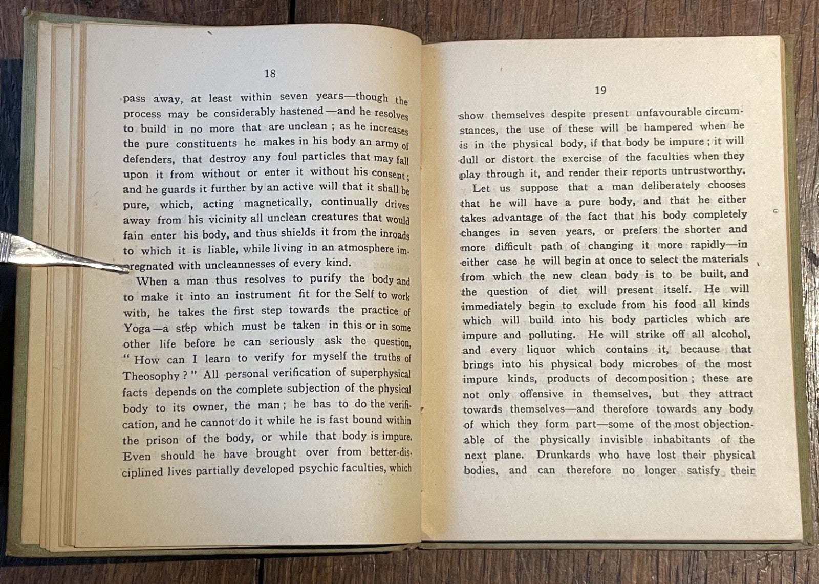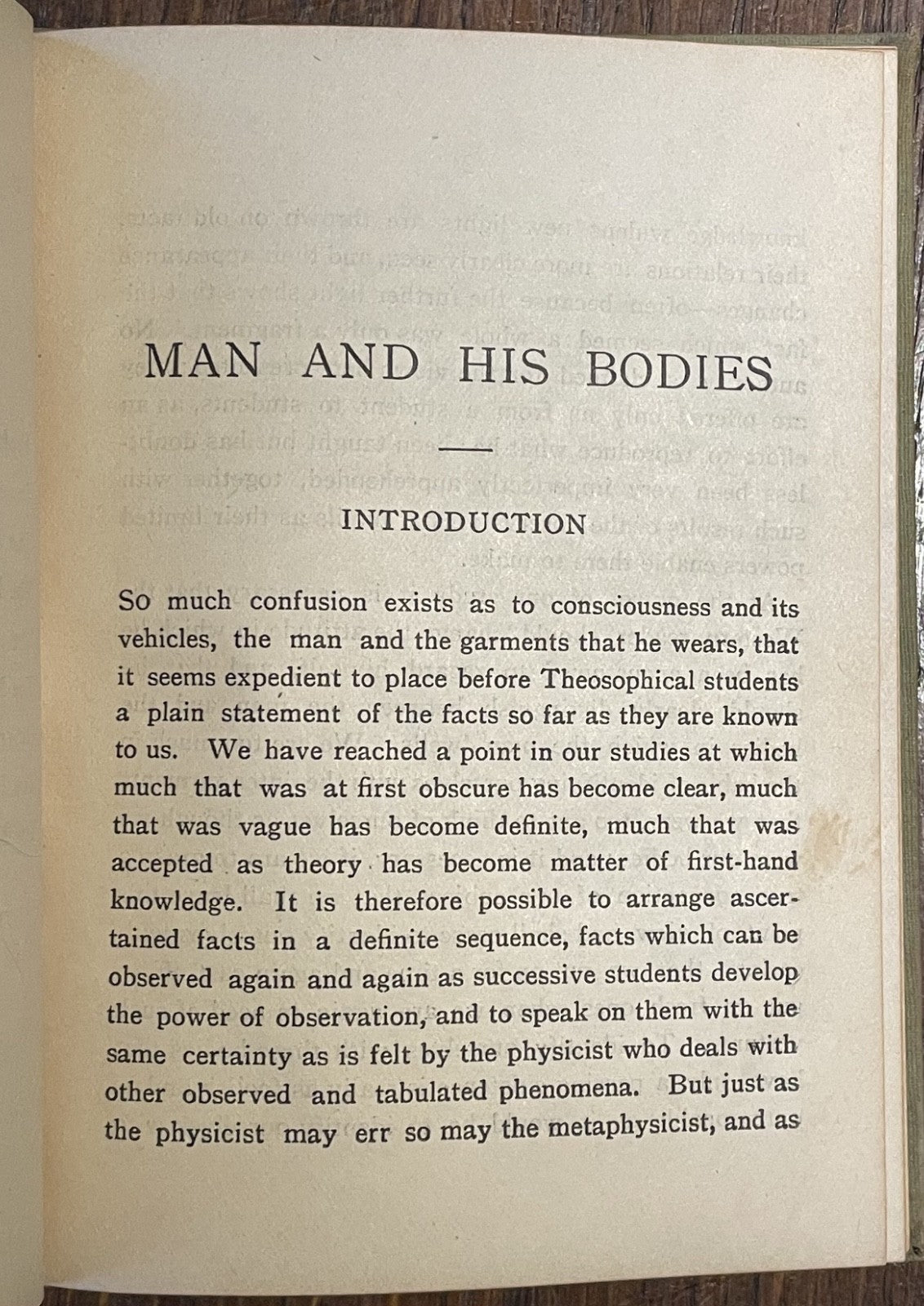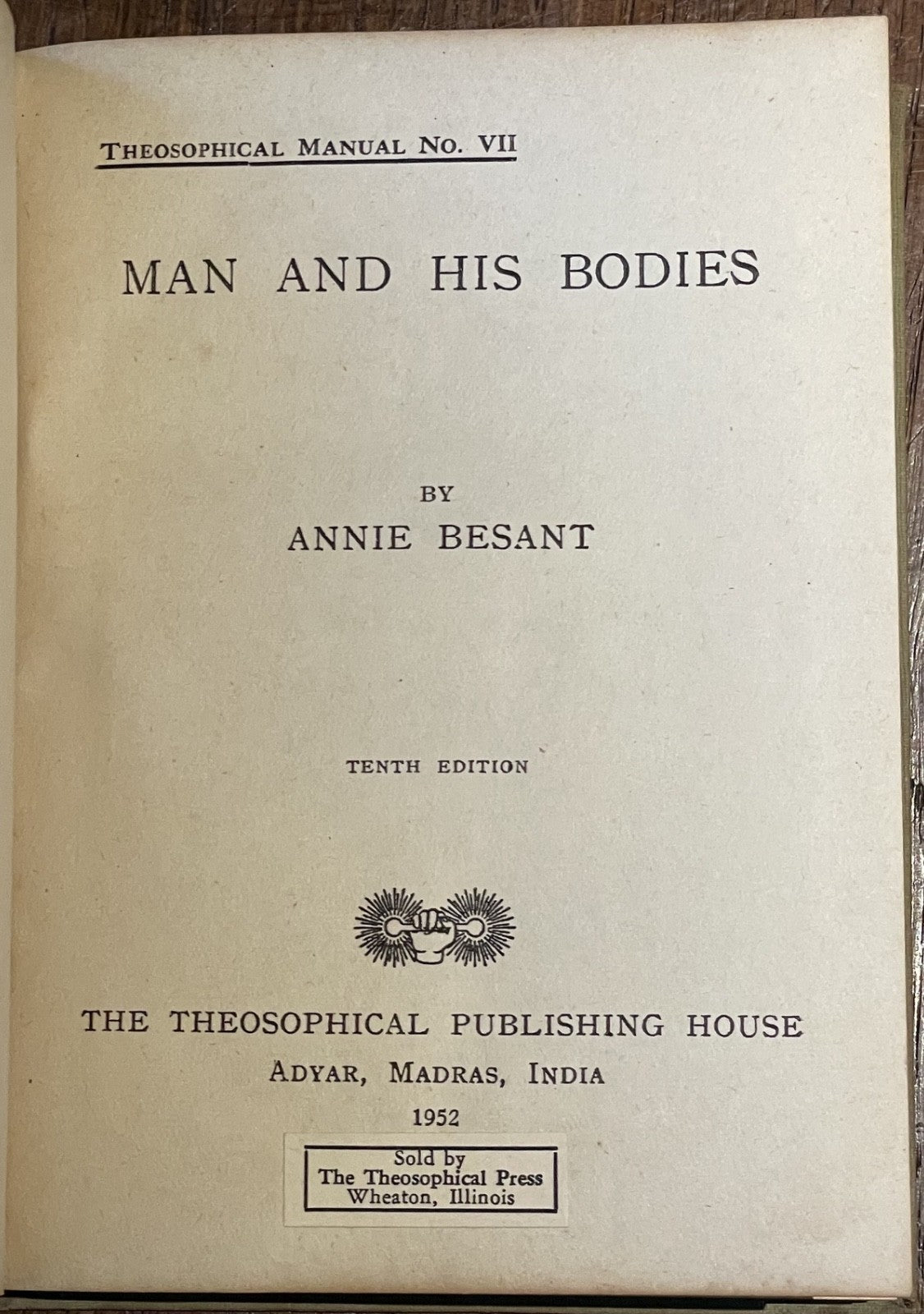 Book Details + Condition: The Theosophical Publishing House (Adyar, Madras, India). Tenth Edition, 1952. Hardcover measuring 6.25" x 4.5". 125 pages. In this Theosophical text, Annie Besant concludes that humans are not just their physical body, but are instead composed of multiple, interconnected spiritual and subtle bodies. The book explores these "bodies" as vehicles for the soul's evolution, and aims to provide a deeper understanding of human existence beyond the material, ultimately revealing the true, divine Self that is distinct from its temporary vehicle. Content includes: