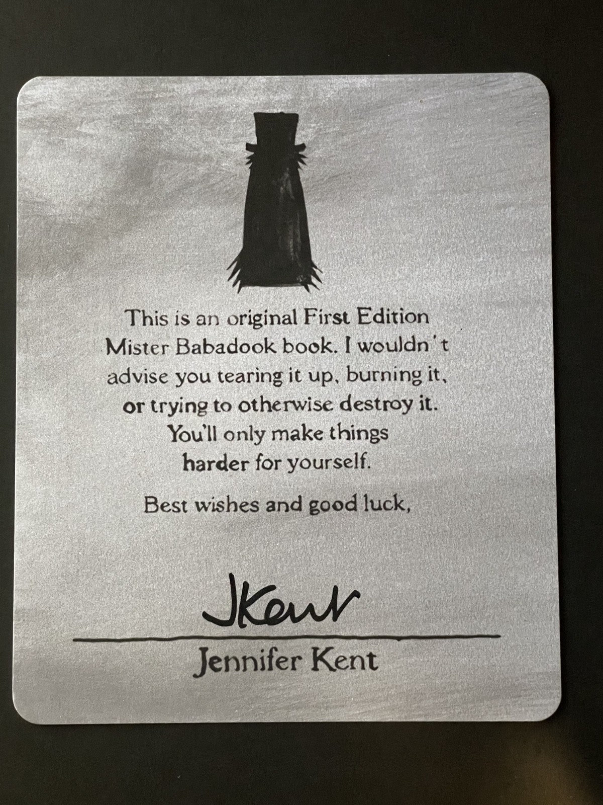 Book Details + Condition: Insight Editions (np). First and Limited Edition, 2016. Hardcover. Unpaginated (42 pages). Limited edition of 6200 copies and SIGNED by director Jennifer Kent on a pasted plate, to the rear. The book was intended to correspond as a limited edition piece of movie memorabilia for the movie BABADOOK. Film director Kent partnered with paper engineer Simon Arizpe and illustrator Alexander Juhasz to bring that accursed volume to life. From Paperspecs: "'All the specifications of the book are the same in the limited edition copies as they were in the film version, such as the color, binding and trim size'.... 'However, the film only shows a few pages from the book. In creating the limited edition we used those same pages but also designed several new pages to complete the story.'"