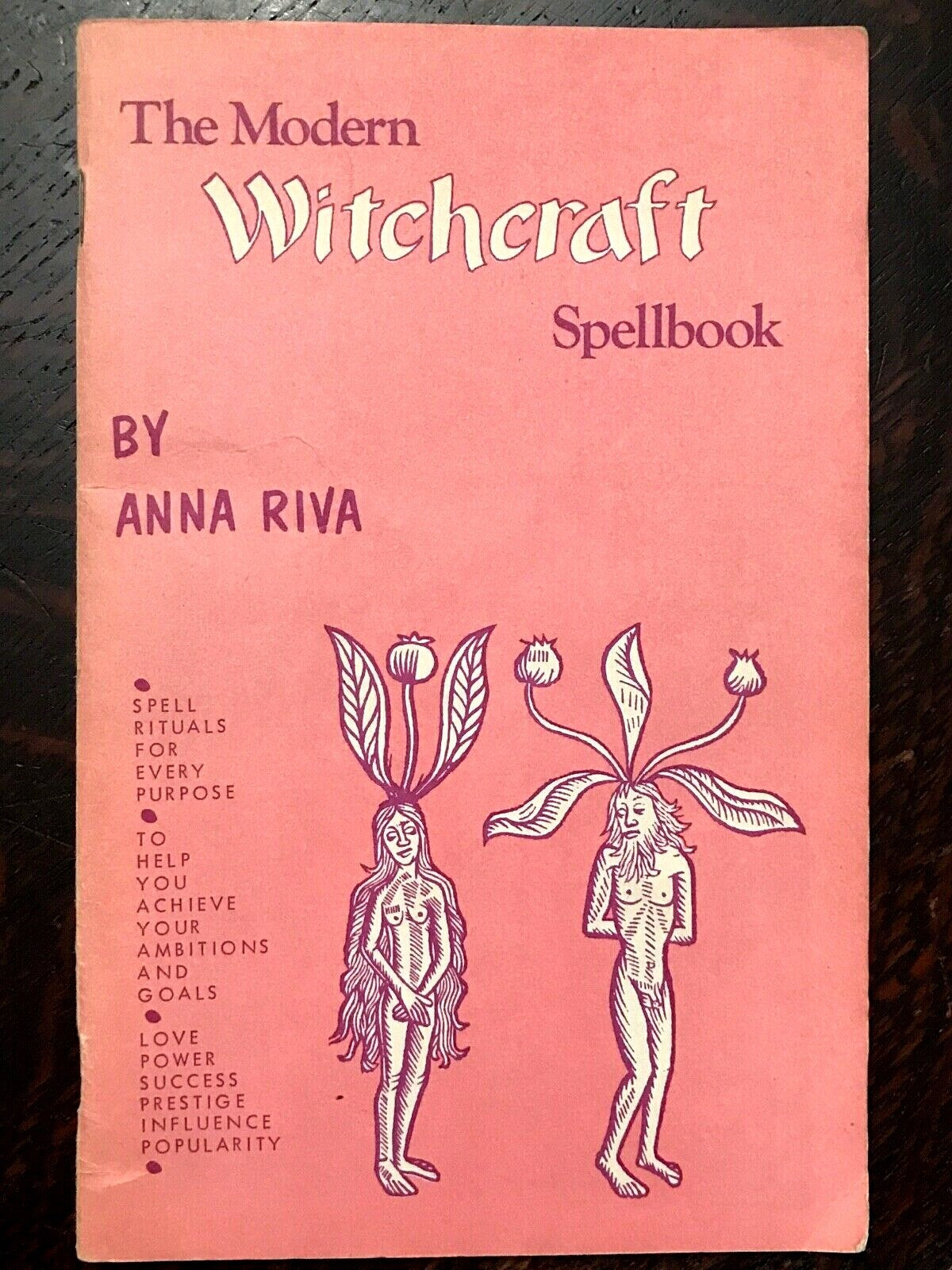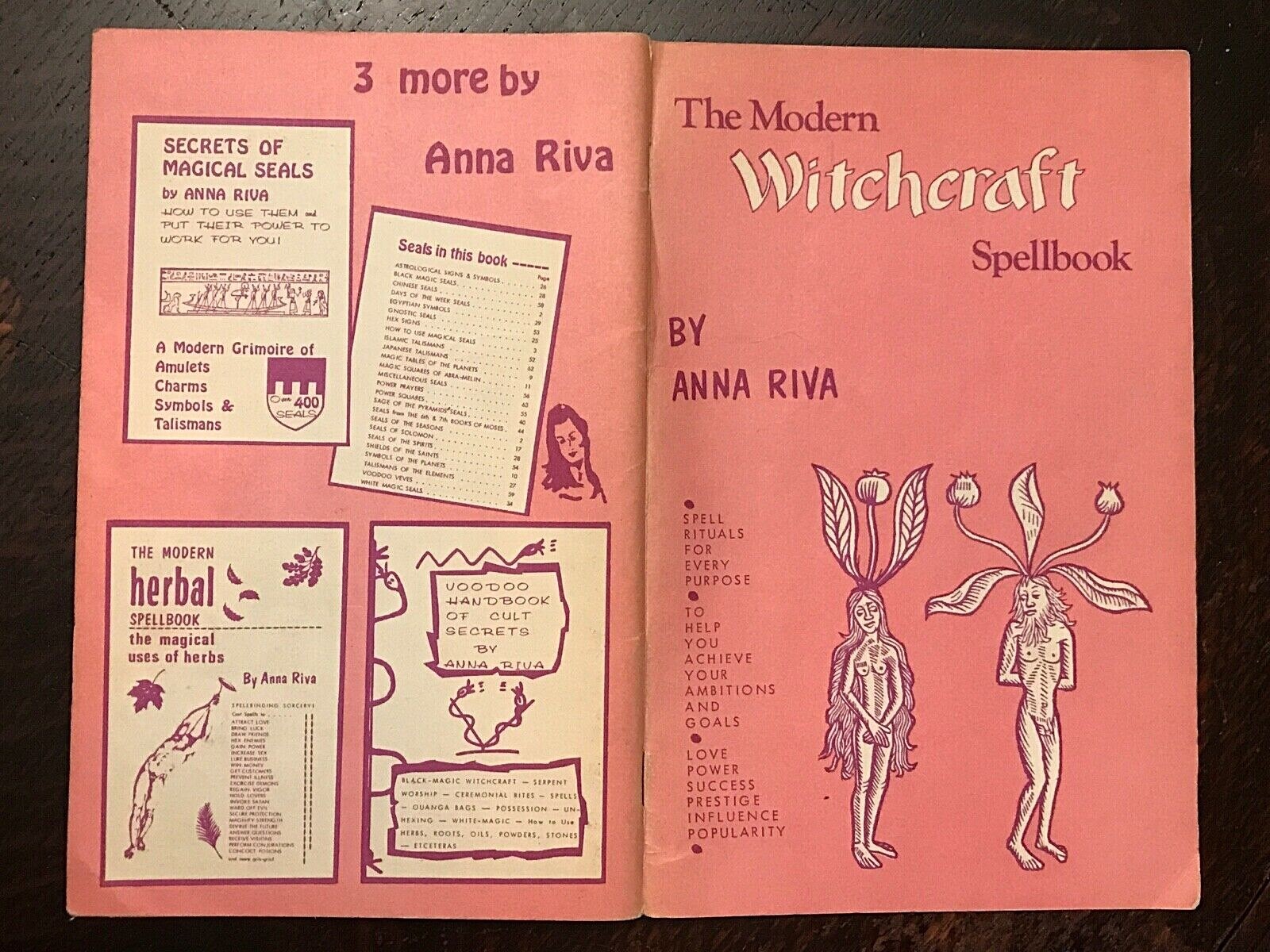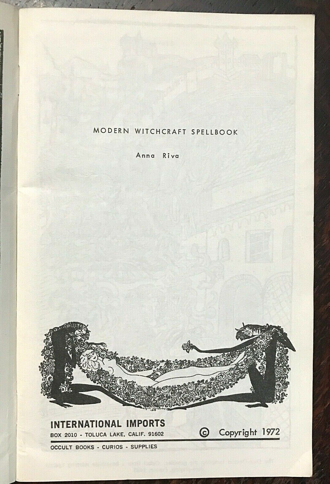 Book Details + Condition: International Imports (Tolucka Lake). First Edition, 1972. Scarce. 62 pages. Illustrated throughout with b&w images. Softcover. One of Anna Riva's most well known Wicca instructional books focusing on everyday useful spells for modern-day witches. The book's practical and easy to understand instructions makes it an excellent guide to beginners and experienced witches alike. Contents include: Herbs and Roots For Black Magic, Love and Attraction; Power, and Protection; Spells To Attract The Love Of The Opposite Sex; Spells To Bring Peace Between Lovers; Spells To Change Bad Luck To Good; Spells To Conquer Those Who Make You Suffer; Spells To Cross Enemies; Spells To Gain And Develop Happiness; Spells To Gain Strength And Receive Spiritual Blessings; Spells To Gain Luck With Gambling; Spells To Gain Prosperity and Better Peace at Home; and more. An overall firm and clean copy of a scarce first edition, with tight binding; light wear to covers; interior is clean and free of markings.