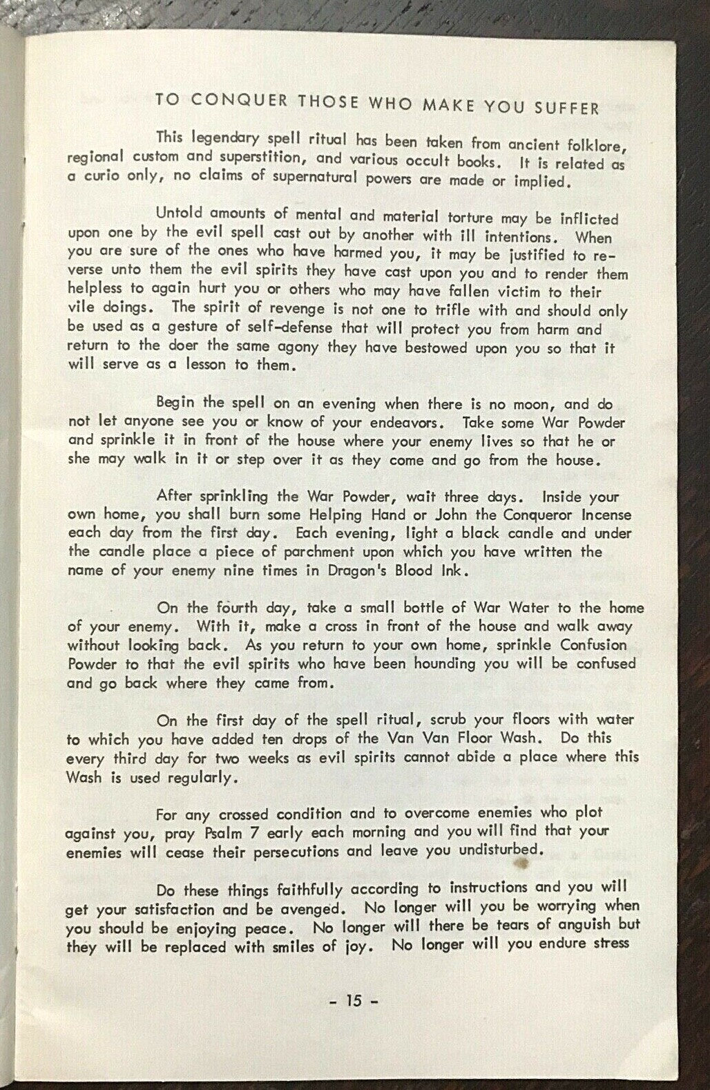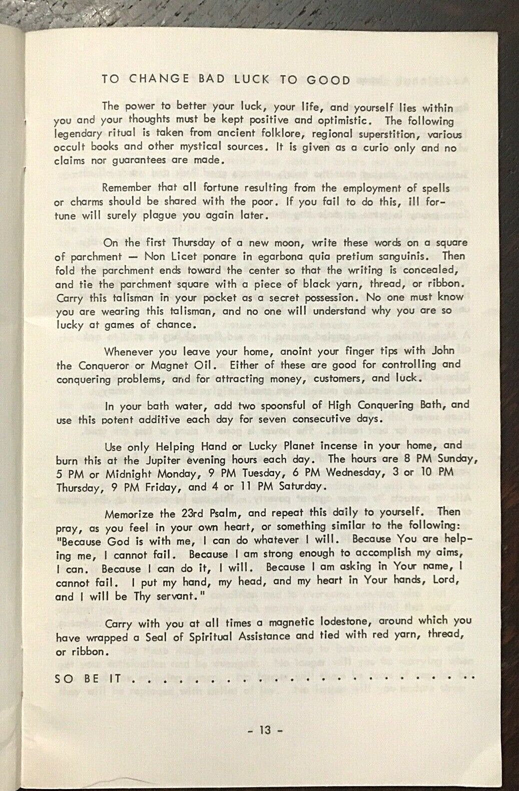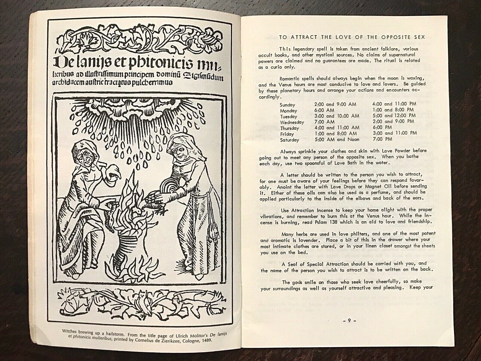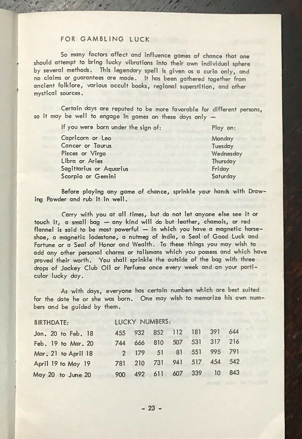 Book Details + Condition: International Imports (Tolucka Lake). First Edition, 1972. Scarce. 62 pages. Illustrated throughout with b&w images. Softcover. One of Anna Riva's most well known Wicca instructional books focusing on everyday useful spells for modern-day witches. The book's practical and easy to understand instructions makes it an excellent guide to beginners and experienced witches alike. Contents include: Herbs and Roots For Black Magic, Love and Attraction; Power, and Protection; Spells To Attract The Love Of The Opposite Sex; Spells To Bring Peace Between Lovers; Spells To Change Bad Luck To Good; Spells To Conquer Those Who Make You Suffer; Spells To Cross Enemies; Spells To Gain And Develop Happiness; Spells To Gain Strength And Receive Spiritual Blessings; Spells To Gain Luck With Gambling; Spells To Gain Prosperity and Better Peace at Home; and more. An overall firm and clean copy of a scarce first edition, with tight binding; light wear to covers; interior is clean and free of markings.