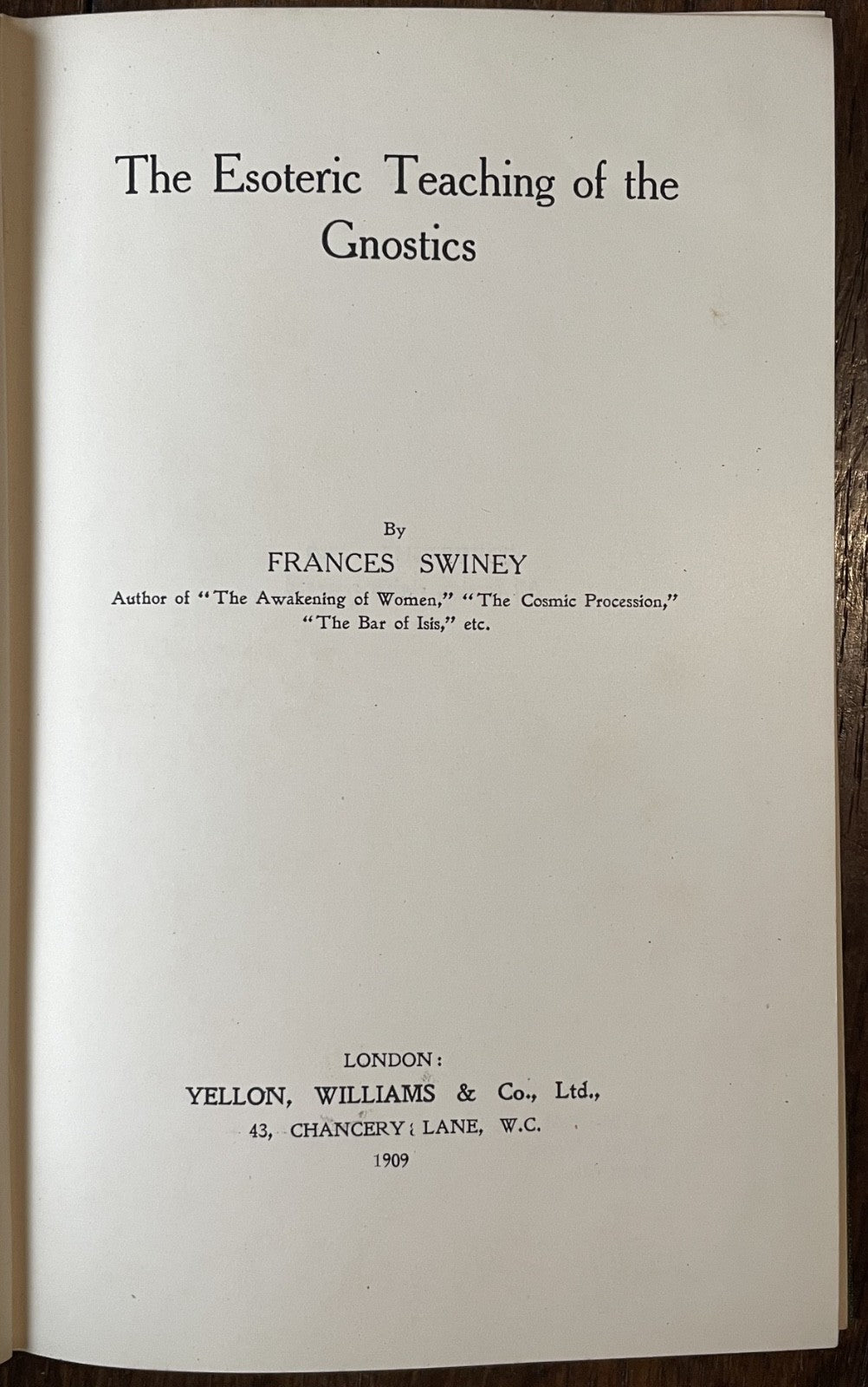 Book Details + Condition: Yellon, Williams & Co. Ltd. (London). First Edition, 1909. Very scarce. Hardcover with green cloth boards, gilt to front and spine. 87 pages. Illustrated with channelled spirit allegories. Signed and inscribed by the author on the front free endpaper. British feminist, writer, and Theosophist Frances Swiney explores the teachings of the Gnostics, a group of early Christians who believed in a secret knowledge that could lead to salvation. The book examines the history of the Gnostics, their beliefs, and their impact on early Christianity. The texts and scriptures that were important to the Gnostics are further explored, including the Gospel of Thomas and the Gospel of Mary Magdalene. Gnostic teachings, including their views on the nature of God, the universe, and the human soul, are studied. The book also considers the influence of Gnosticism on Western philosophy and spirituality, and how its teachings continue to resonate.