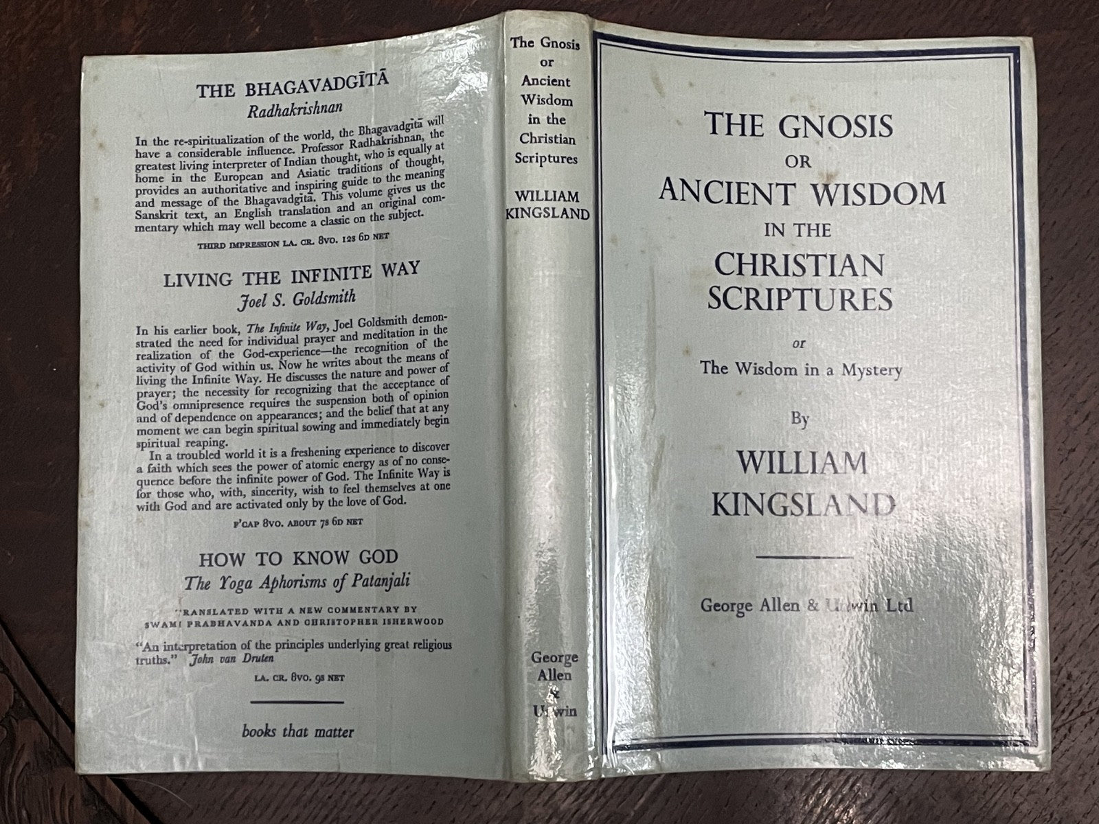 Book Details + Condition: George Allen and Unwin Ltd. (London). Second Edition, 1954. Hardcover with dust jacket. 218 pages with Index, Bibliography and Advertisements. William Kingsland's work explores the concept of gnosis, which refers to the knowledge of spiritual mysteries and insights that can only be gained through personal experience and intuition. The book examines the presence of gnosis in the Christian scriptures, particularly in the teachings of Jesus and the early Christian mystics. Kingsland also explores the relationship between gnosis and other ancient wisdom traditions, such as the teachings of the Egyptian and Greek mystery schools. Chapters include: