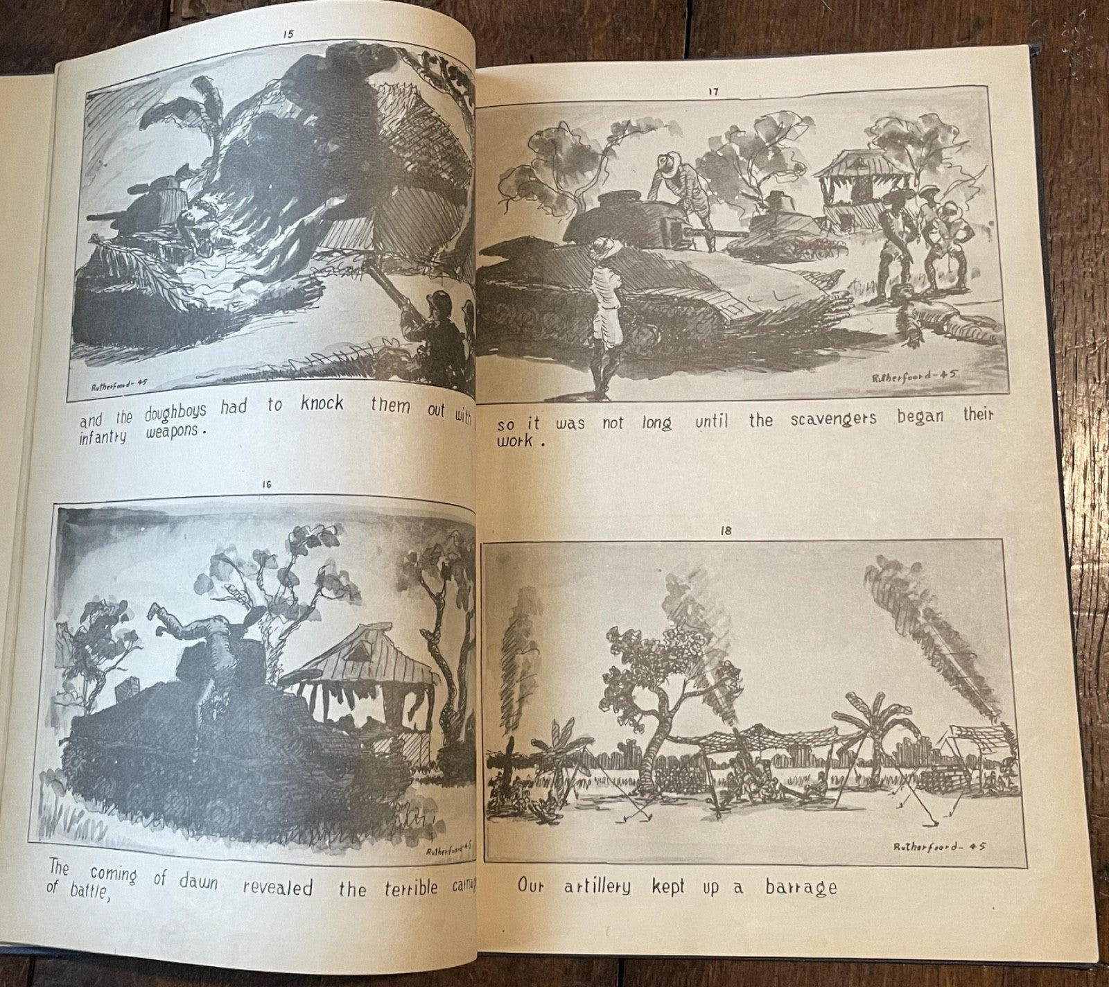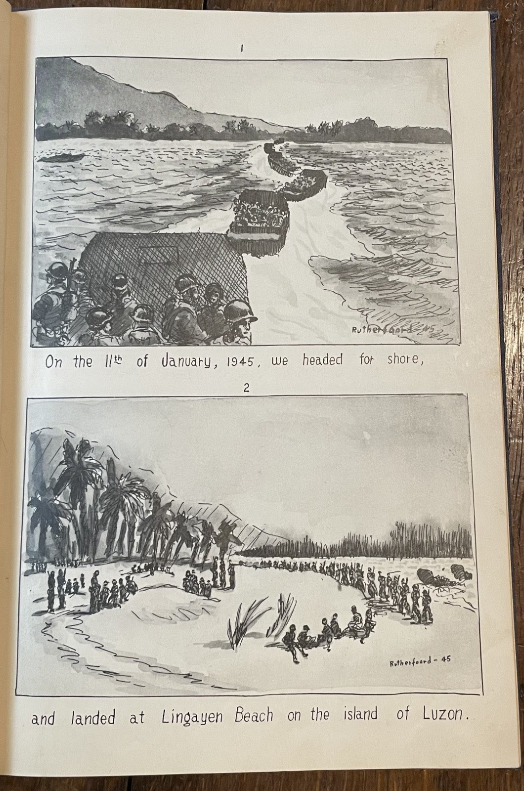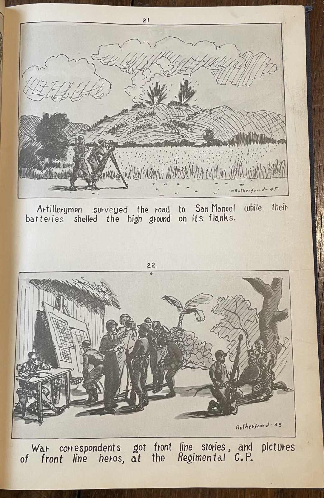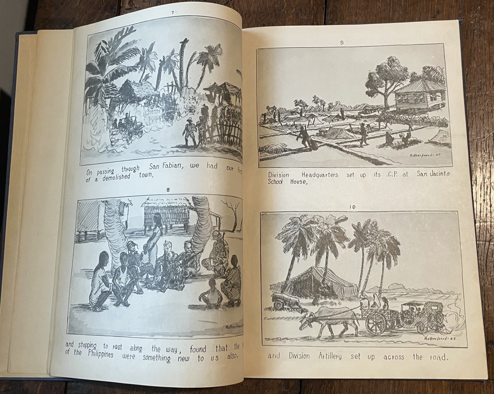 Book Details + Condition: Published by the 25th Division, US Army (Manila, Philippines). First Edition, 1945. Hardcover measuring 13" x 9". 92 pages (unpaginated). Profusely illustrated with 176 panel drawings by author and soldier William de Jarnette Rutherfoord, while fighting the Japanese at Luzon, Philippines. The book, based on his personal diary as well as on official military records and interviews with other veterans, offers a detailed account of his experiences during World War II, specifically his time serving in the 25th Infantry Division on the island of Luzon in the Philippines. Rutherford served as a captain in the 25th Division, which was one of the first American units to land on Luzon in January 1945. The book chronicles the division's progress as they fought their way through the island, facing fierce resistance from Japanese forces along the way. Rutherford provides a vivid and personal account of the battles he fought in, as well as the relationships he formed with his fellow soldiers.