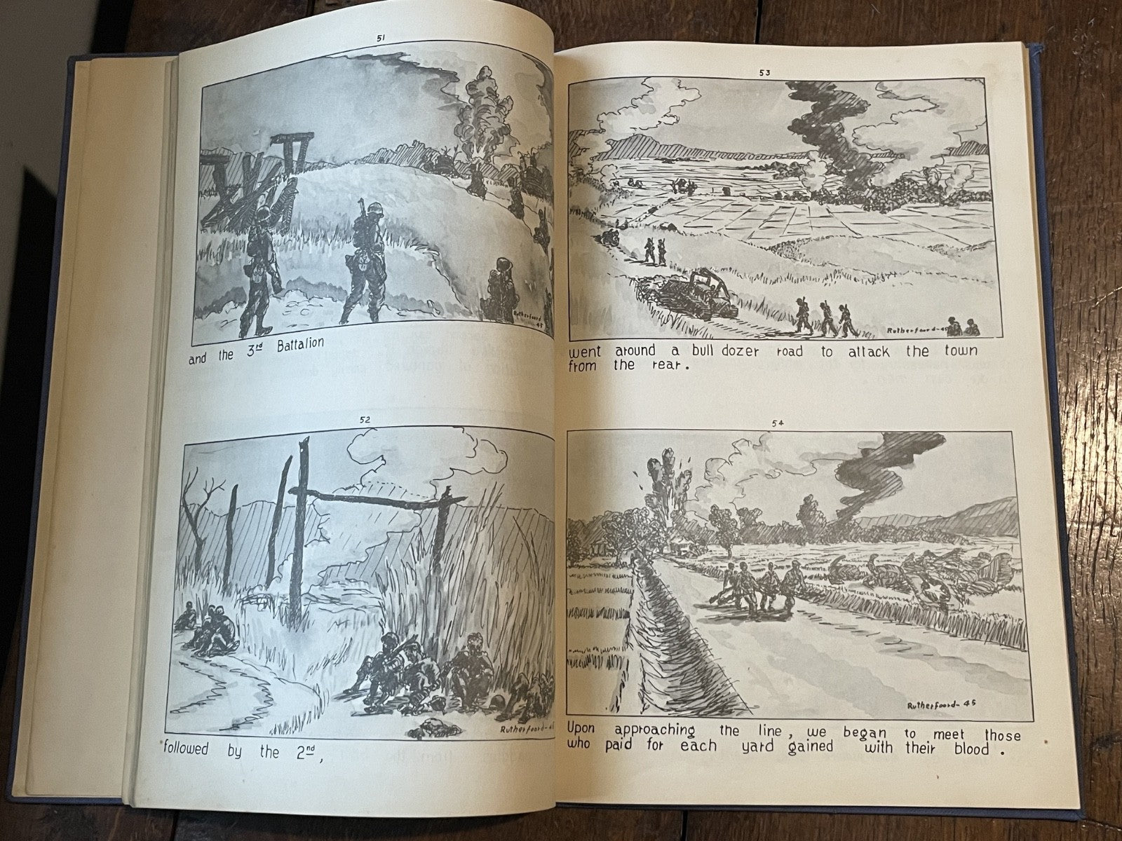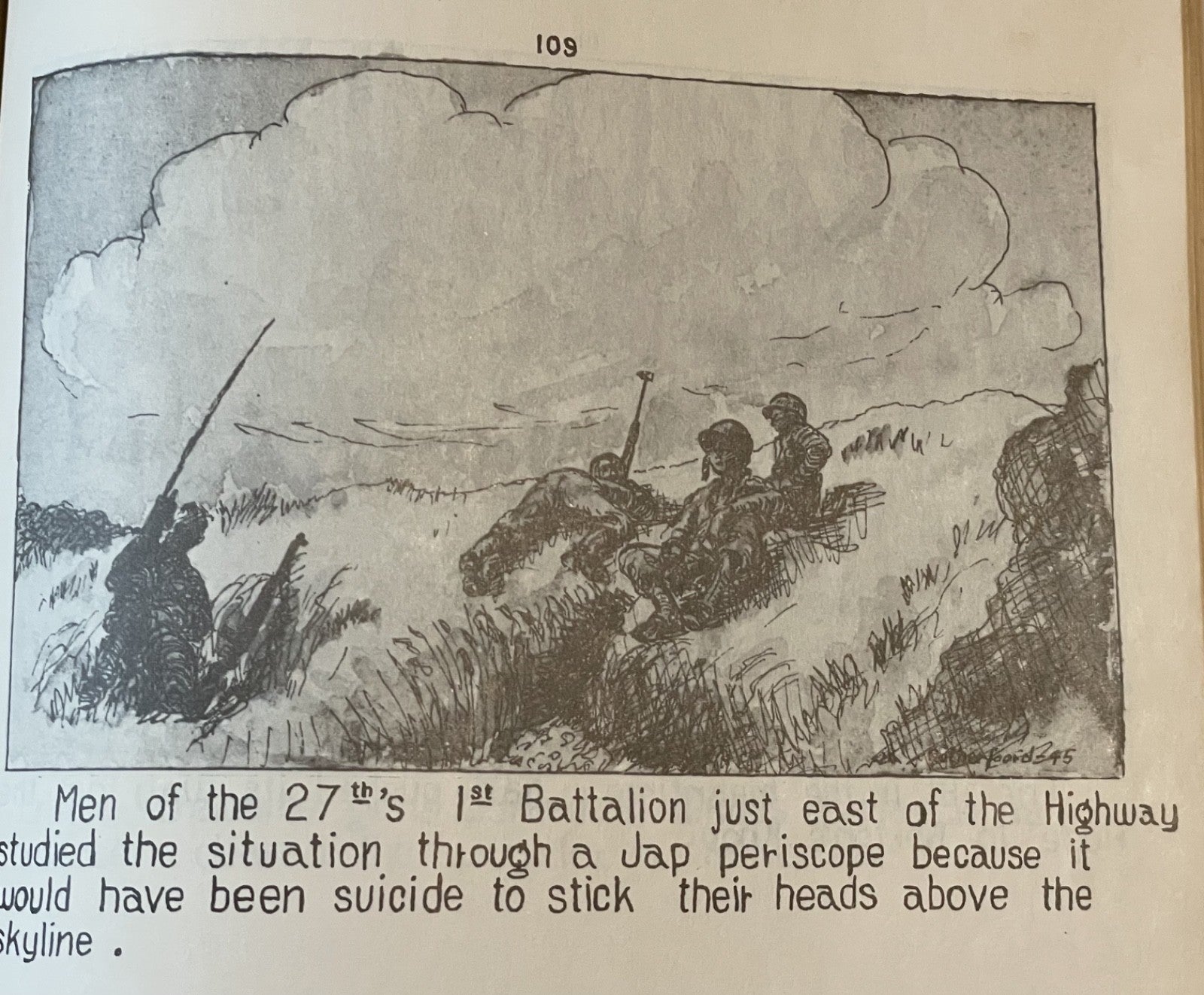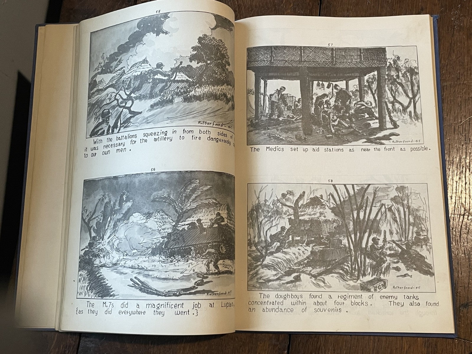 Book Details + Condition: Published by the 25th Division, US Army (Manila, Philippines). First Edition, 1945. Hardcover measuring 13" x 9". 92 pages (unpaginated). Profusely illustrated with 176 panel drawings by author and soldier William de Jarnette Rutherfoord, while fighting the Japanese at Luzon, Philippines. The book, based on his personal diary as well as on official military records and interviews with other veterans, offers a detailed account of his experiences during World War II, specifically his time serving in the 25th Infantry Division on the island of Luzon in the Philippines. Rutherford served as a captain in the 25th Division, which was one of the first American units to land on Luzon in January 1945. The book chronicles the division's progress as they fought their way through the island, facing fierce resistance from Japanese forces along the way. Rutherford provides a vivid and personal account of the battles he fought in, as well as the relationships he formed with his fellow soldiers.