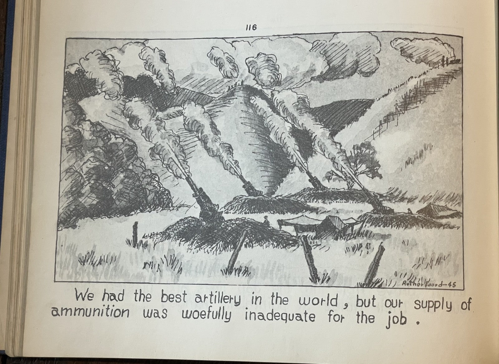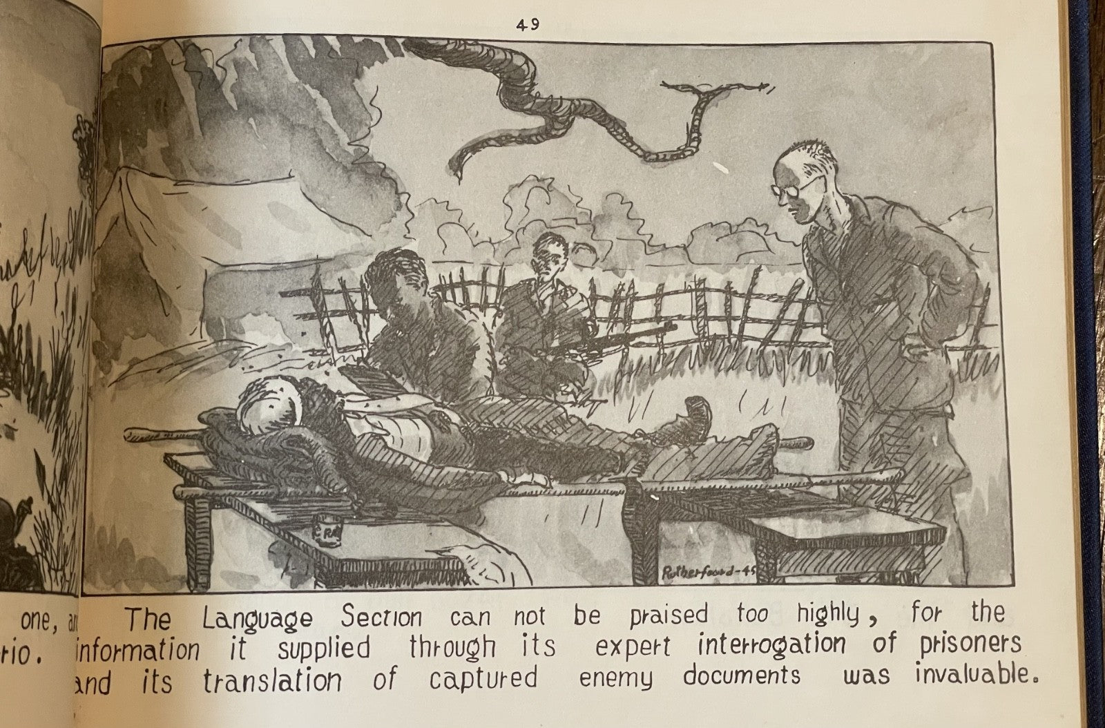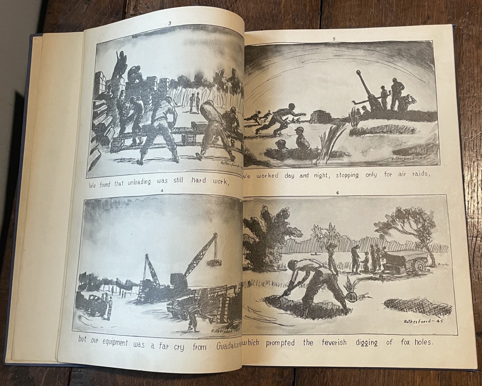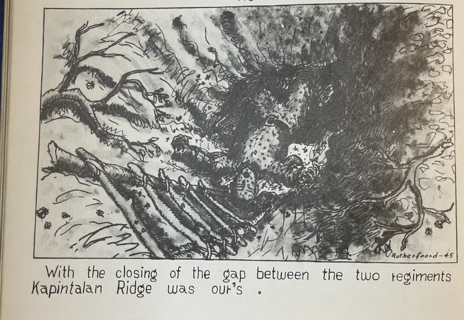 Book Details + Condition: Published by the 25th Division, US Army (Manila, Philippines). First Edition, 1945. Hardcover measuring 13" x 9". 92 pages (unpaginated). Profusely illustrated with 176 panel drawings by author and soldier William de Jarnette Rutherfoord, while fighting the Japanese at Luzon, Philippines. The book, based on his personal diary as well as on official military records and interviews with other veterans, offers a detailed account of his experiences during World War II, specifically his time serving in the 25th Infantry Division on the island of Luzon in the Philippines. Rutherford served as a captain in the 25th Division, which was one of the first American units to land on Luzon in January 1945. The book chronicles the division's progress as they fought their way through the island, facing fierce resistance from Japanese forces along the way. Rutherford provides a vivid and personal account of the battles he fought in, as well as the relationships he formed with his fellow soldiers.
