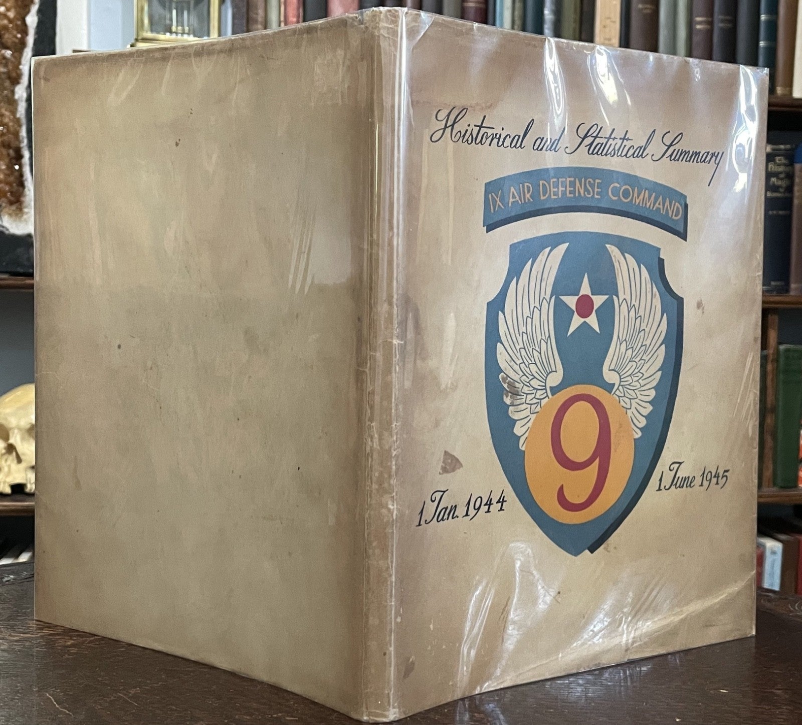 Book Details + Condition: 9th Air Defense Command (np). First Edition, 1945 (nd). Hardcover with original dust jacket. 95 pages. Illustrated with photographs, charts, drawings and map insert. Very scarce, as it was a restricted publication of the 9th Air Defense Command. This World War II command, established in July 1944, provided air defense for liberated areas of Western Europe, including France and the Low Countries. Its statistical and historical summary, which covers January 1944 - June 1945, notes its support of ground forces through armed reconnaissance during major operations like the Normandy breakout and Operation Market-Garden. The command was also responsible for defending liberated airfields, ports, and other critical areas, and had a significant anti-aircraft artillery (AAA) component.