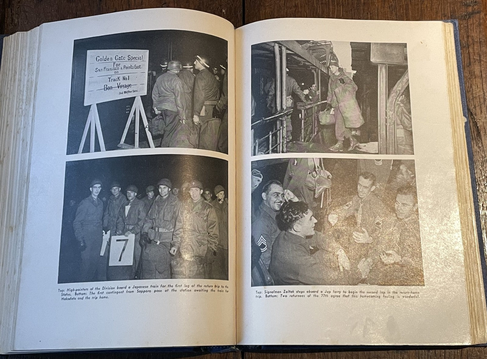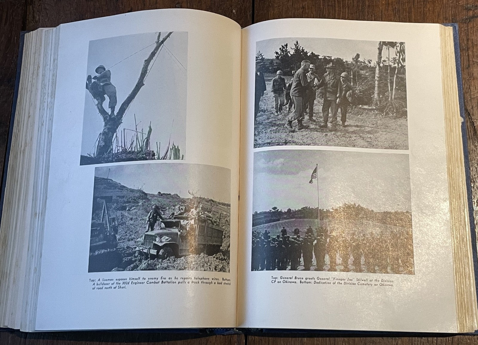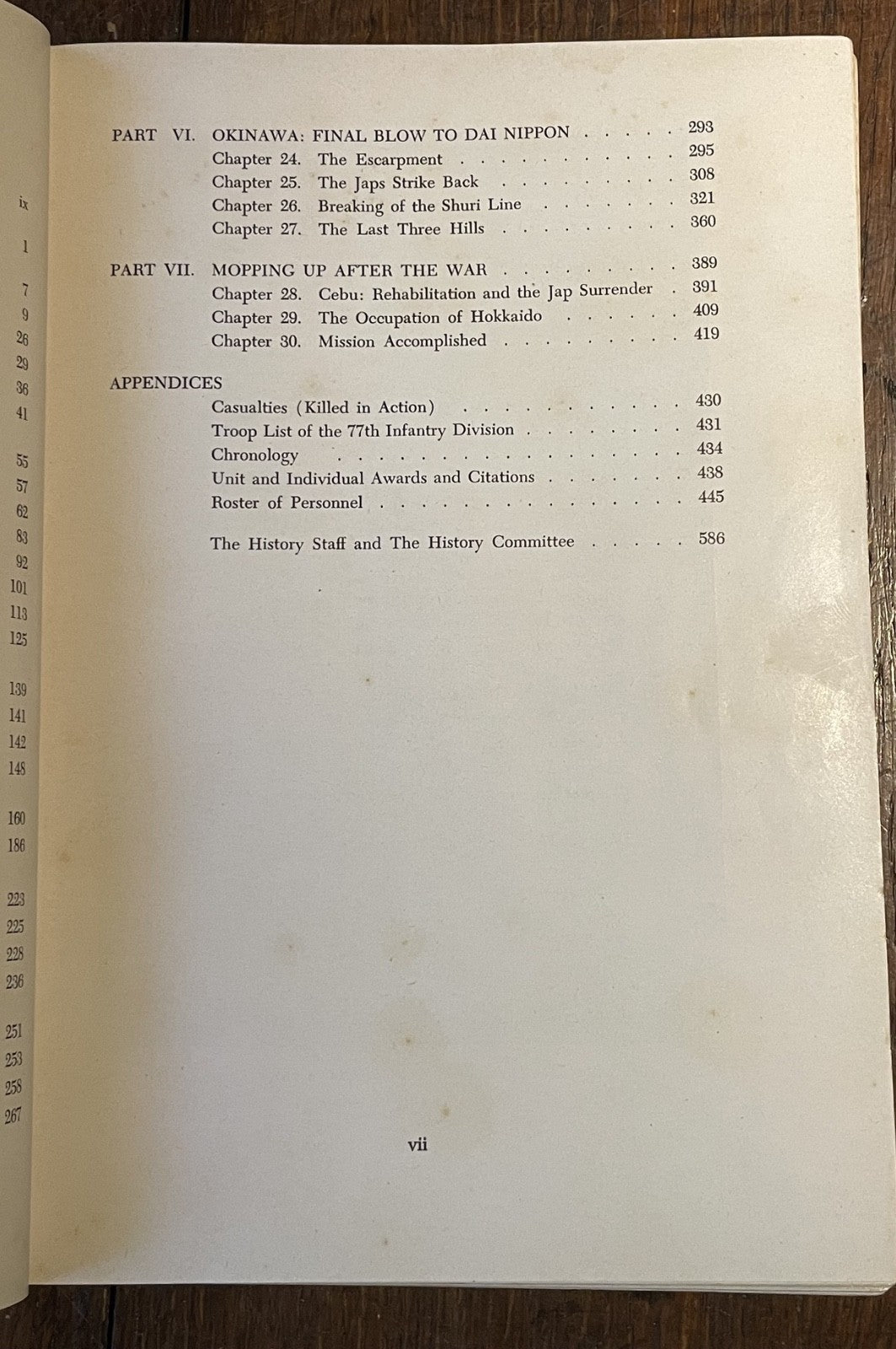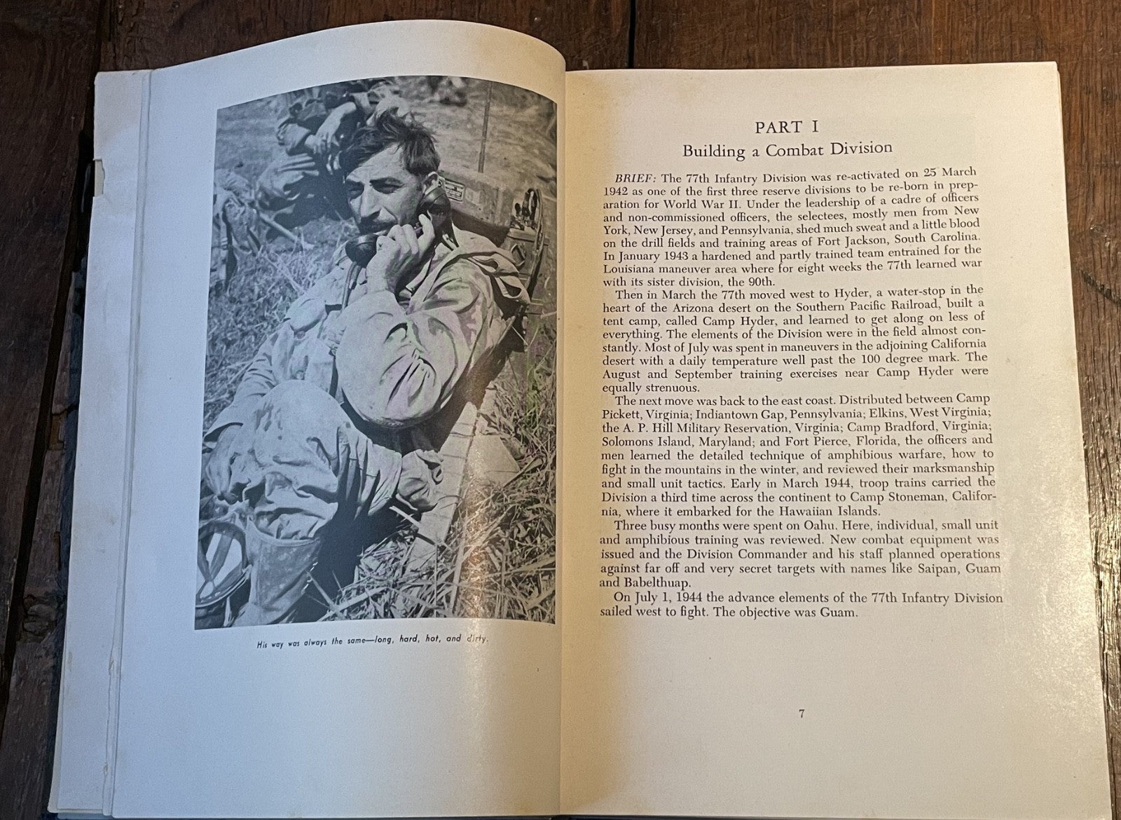 Book Details + Condition: Infantry Journal Press (Washington, DC). First Edition, 1947. Hardcover. 585 pages with maps and photographs. The book chronicles the 77th Infantry Division's combat experiences in the Pacific during WWII, including battles on Guam, Leyte, Kerama Retto, Ie Shima, and Okinawa. It was written by the soldiers themselves, and details the division's activation in 1942, its training, and its bloody island-hopping campaign against fierce Japanese resistance. The division was nicknamed the "Old Bastards" due to its composition of older draftees, who proved to be a formidable fighting force. Chapters include: