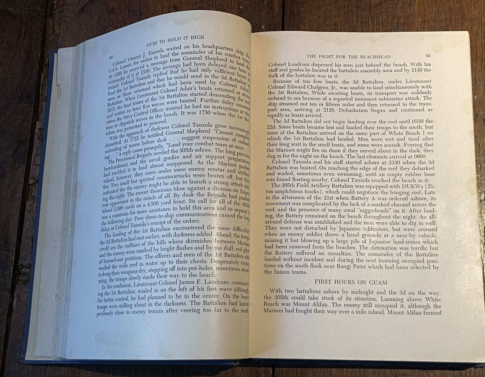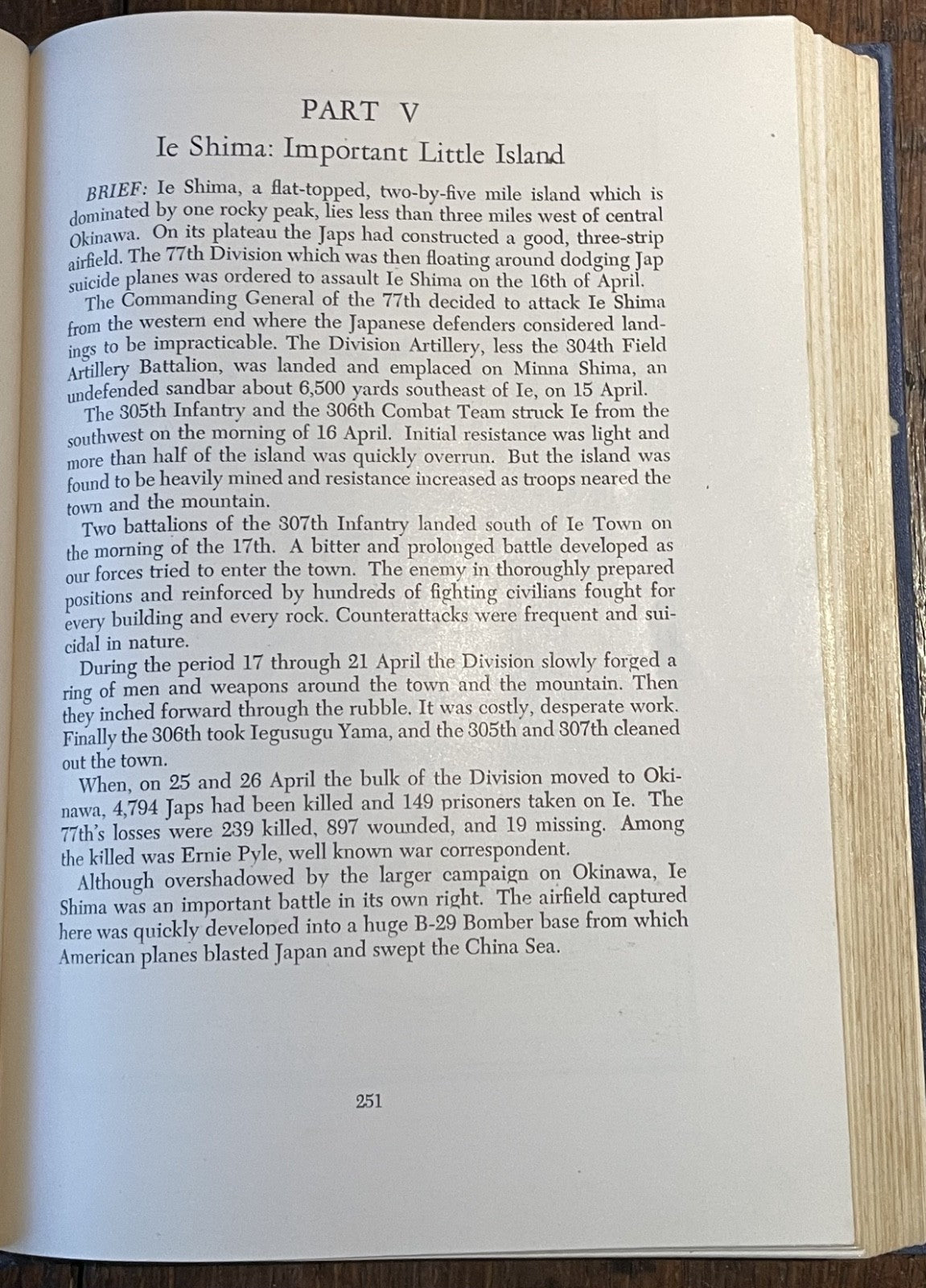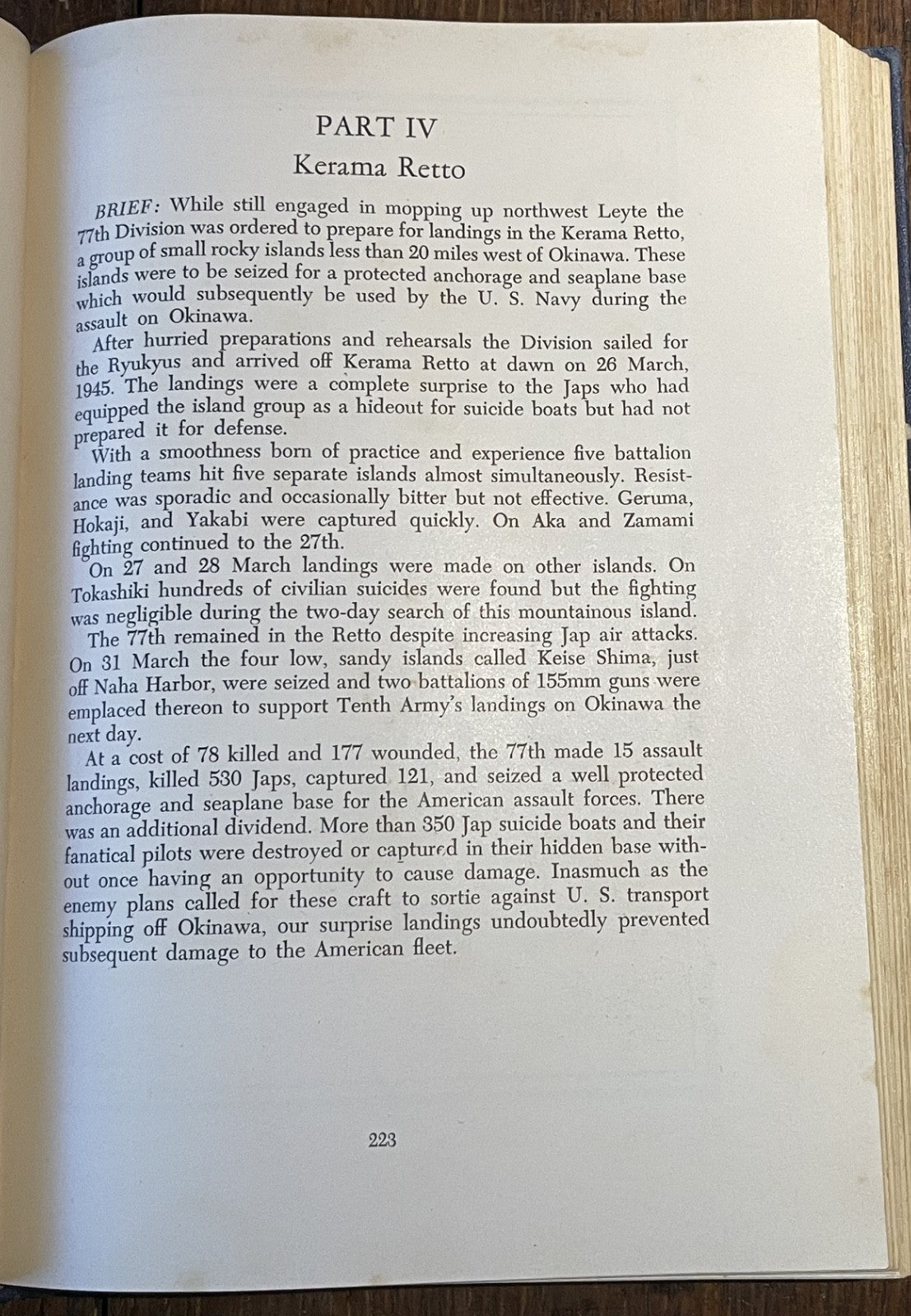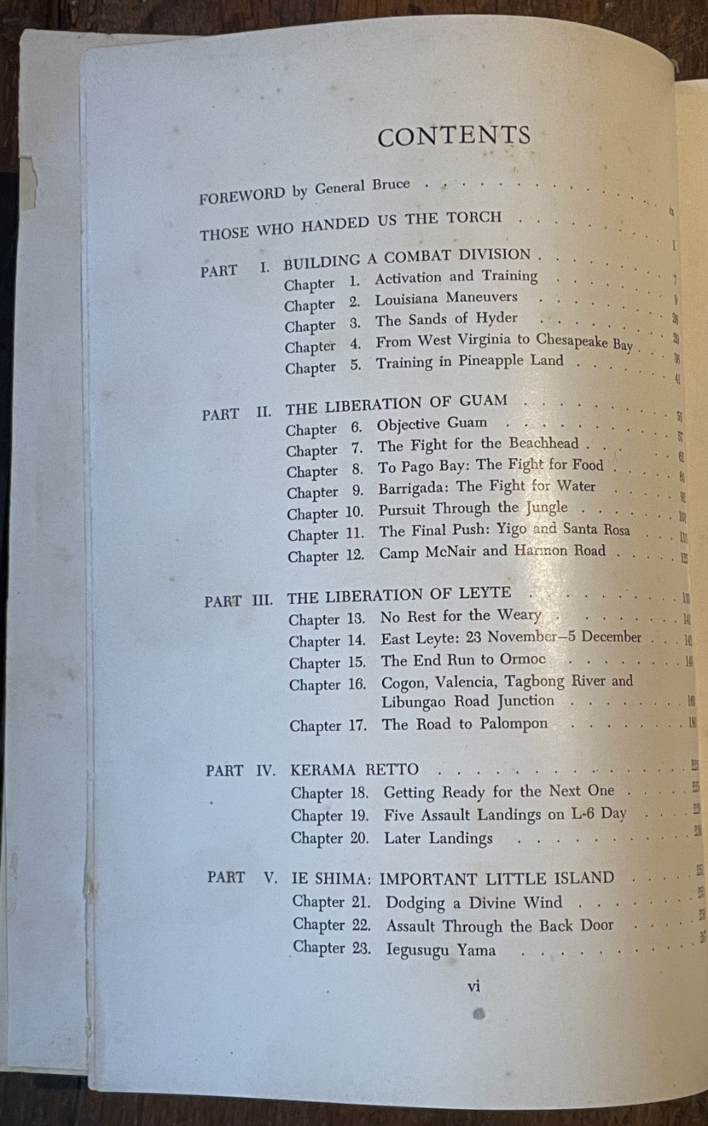 Book Details + Condition: Infantry Journal Press (Washington, DC). First Edition, 1947. Hardcover. 585 pages with maps and photographs. The book chronicles the 77th Infantry Division's combat experiences in the Pacific during WWII, including battles on Guam, Leyte, Kerama Retto, Ie Shima, and Okinawa. It was written by the soldiers themselves, and details the division's activation in 1942, its training, and its bloody island-hopping campaign against fierce Japanese resistance. The division was nicknamed the "Old Bastards" due to its composition of older draftees, who proved to be a formidable fighting force. Chapters include:
