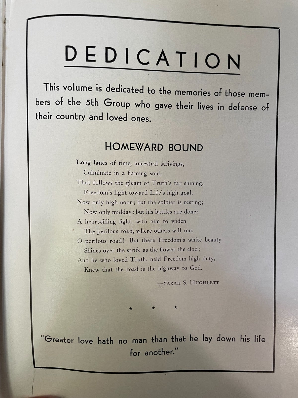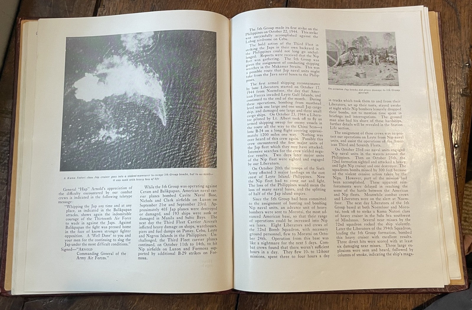 Book Details + Condition: Hillsborough House (Raleigh, NC). First Edition, 1946. Hardcover with dark red embossed boards. 104 pages (unpaginated), and illustrated with b&w photographs. The book details the history of the Fifth Bombardment Group, from its origins in the 1910s through World War II, detailing its crucial role in the war in the Pacific. It covers the group's early history, including its response to the attack on Pearl Harbor and its combat missions from Guadalcanal, Munda, and Samar to the bombing of Balikapan and the occupation of Japan. The book highlights the strategic importance of heavy bombers and the bravery of the men who served, providing a comprehensive account of the unit's contributions.