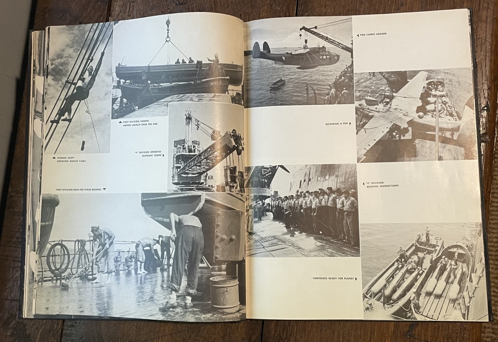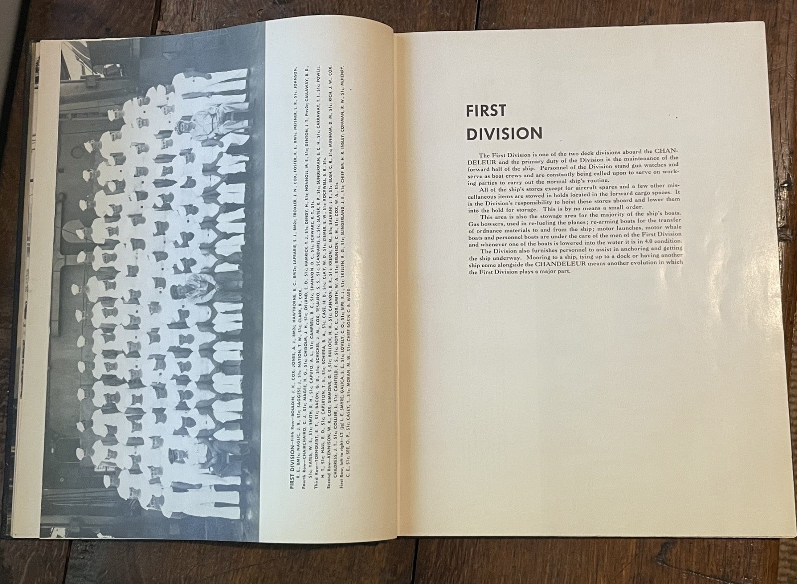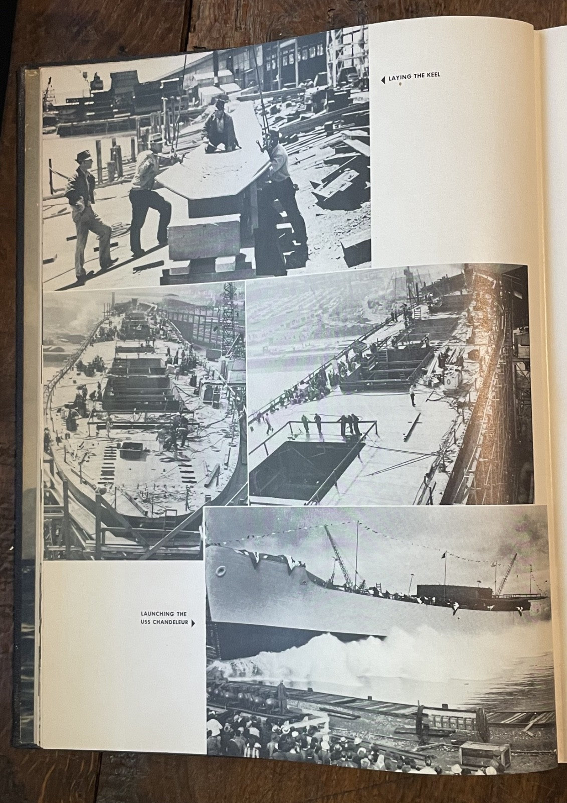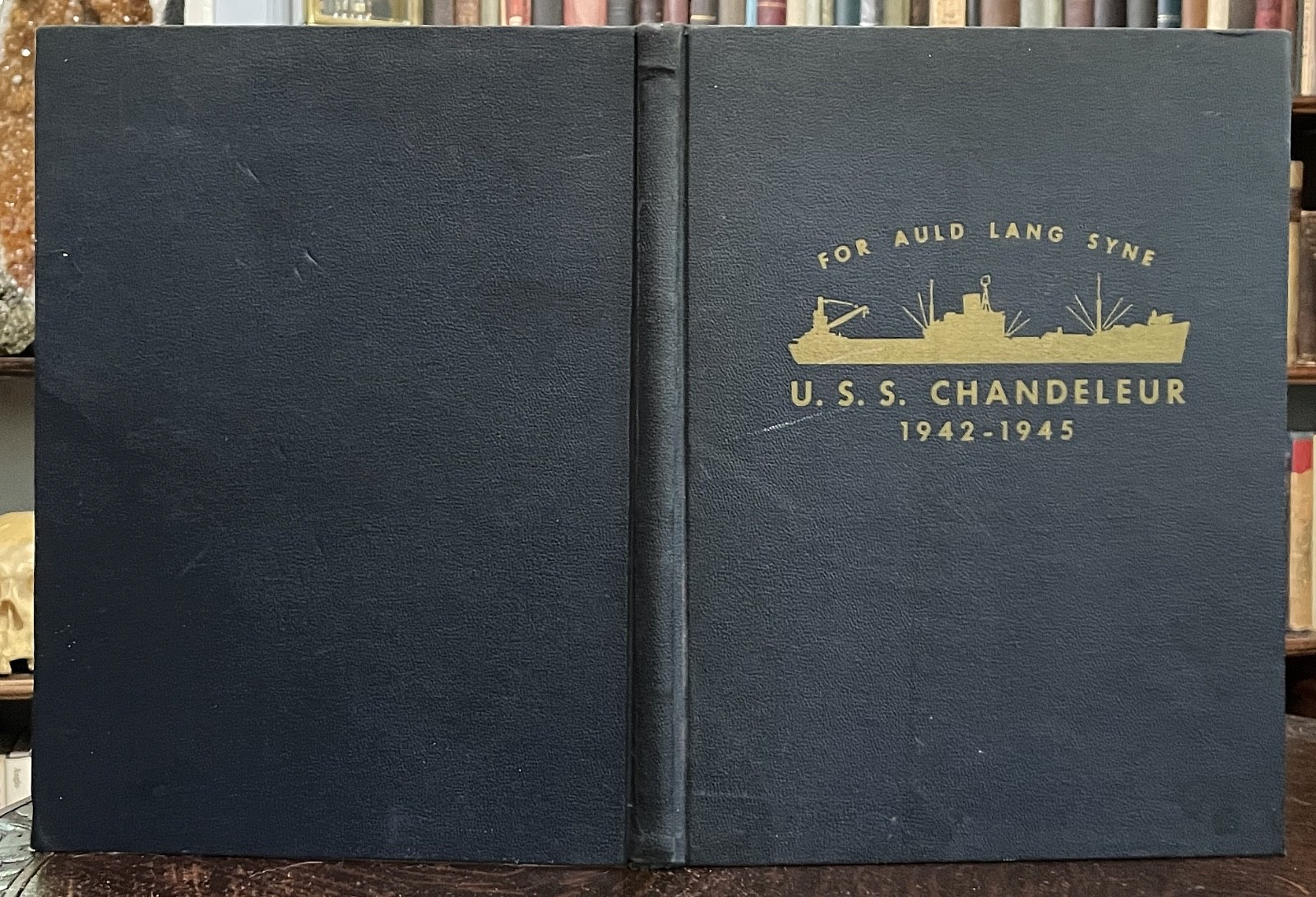 Book Details + Condition: Schwabacher-Frey Company (San Francisco, CA). First Edition, 1946. Hardcover measuring approximately 12" x 9.5". 138 pages. Illustrated with photographs. The book details the naval vessel's significant World War II service as a seaplane tender in the Pacific Theater, supporting reconnaissance and attack missions, troop and cargo transport, and the capture of key islands like the Palau and Ryukyus chains. The ship played a role in major actions, including spotting the Japanese battleship Yamato for sinking and operating from bases that included Okinawa. The Chandeleur earned five battle stars for its contributions before being decommissioned and scrapped in the early 1970s.