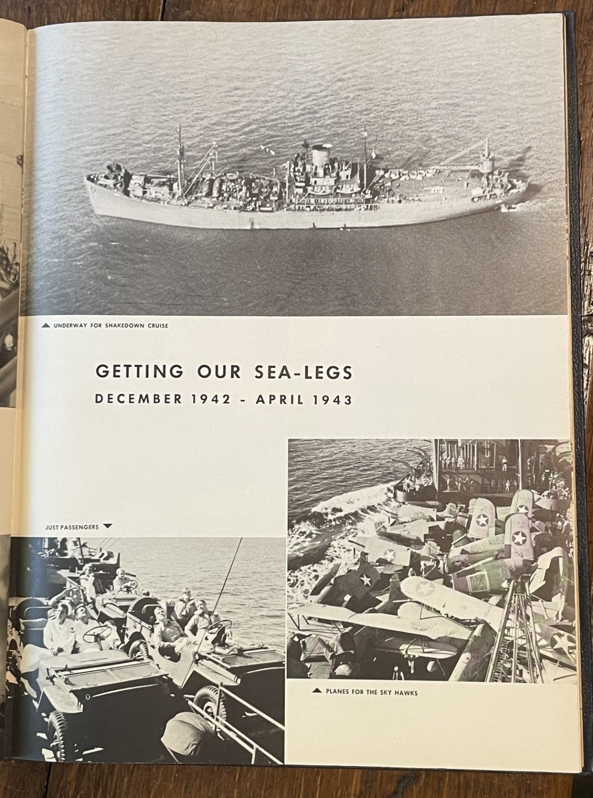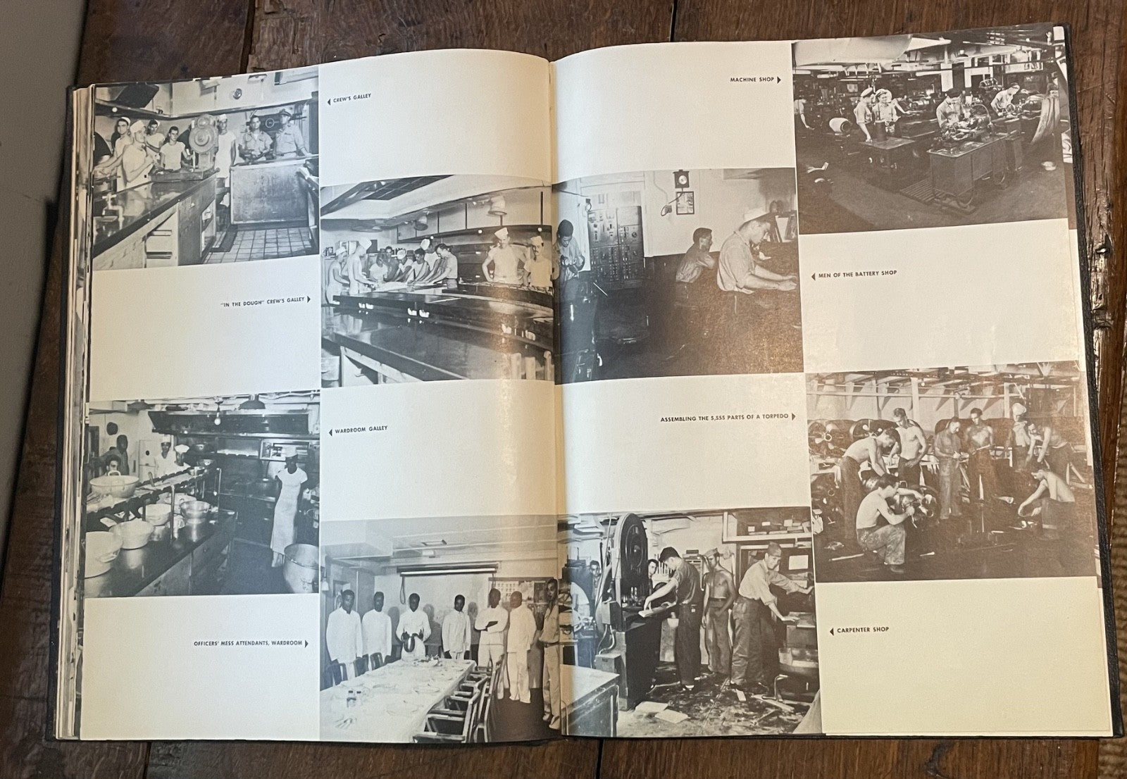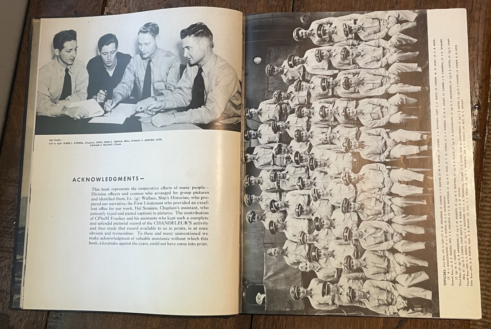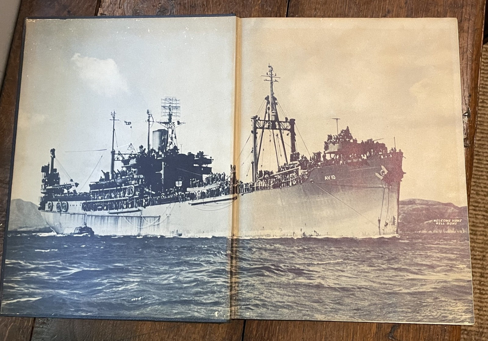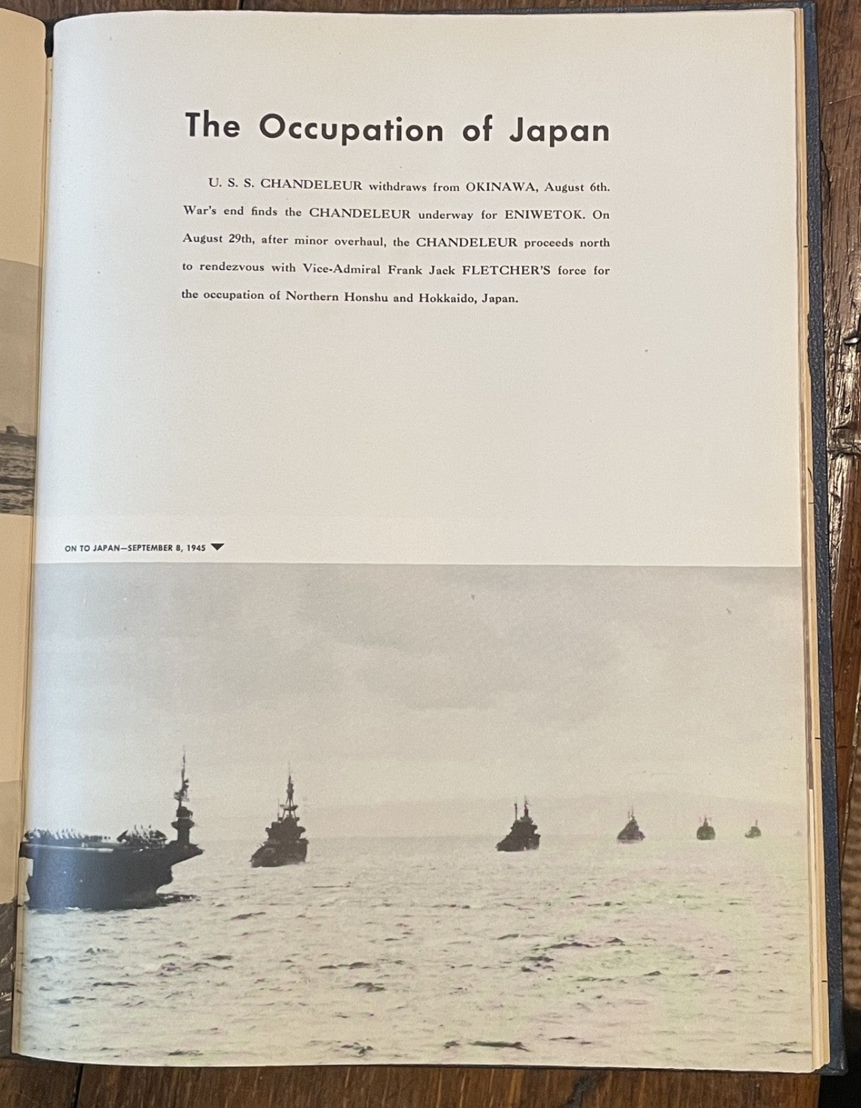 Book Details + Condition: Schwabacher-Frey Company (San Francisco, CA). First Edition, 1946. Hardcover measuring approximately 12" x 9.5". 138 pages. Illustrated with photographs. The book details the naval vessel's significant World War II service as a seaplane tender in the Pacific Theater, supporting reconnaissance and attack missions, troop and cargo transport, and the capture of key islands like the Palau and Ryukyus chains. The ship played a role in major actions, including spotting the Japanese battleship Yamato for sinking and operating from bases that included Okinawa. The Chandeleur earned five battle stars for its contributions before being decommissioned and scrapped in the early 1970s.