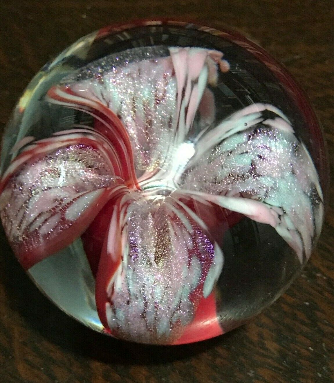 Sparkling blooming flower glass paperweight by Glass Eye Studio. Stamped with "GES 99" makers mark on the bottom. Please see pictures for condition and details. 3" diameter.